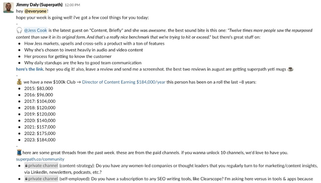 Salah satu contoh bagus dari komunitas Slack yang sangat aktif adalah Superpath, grup Slack yang berfokus pada pemasaran konten. Pendiri menerbitkan postingan di saluran #announcement untuk berbagi konten berharga, percakapan dalam grup, dan ajakan bertindak untuk bergabung dengan saluran berbayar.