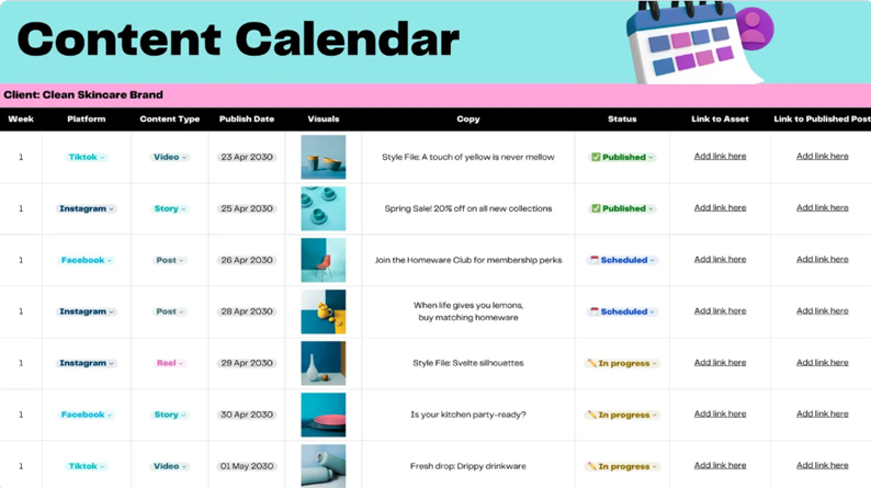 Contoh template kalender konten untuk beberapa platform medsos dari Canva.