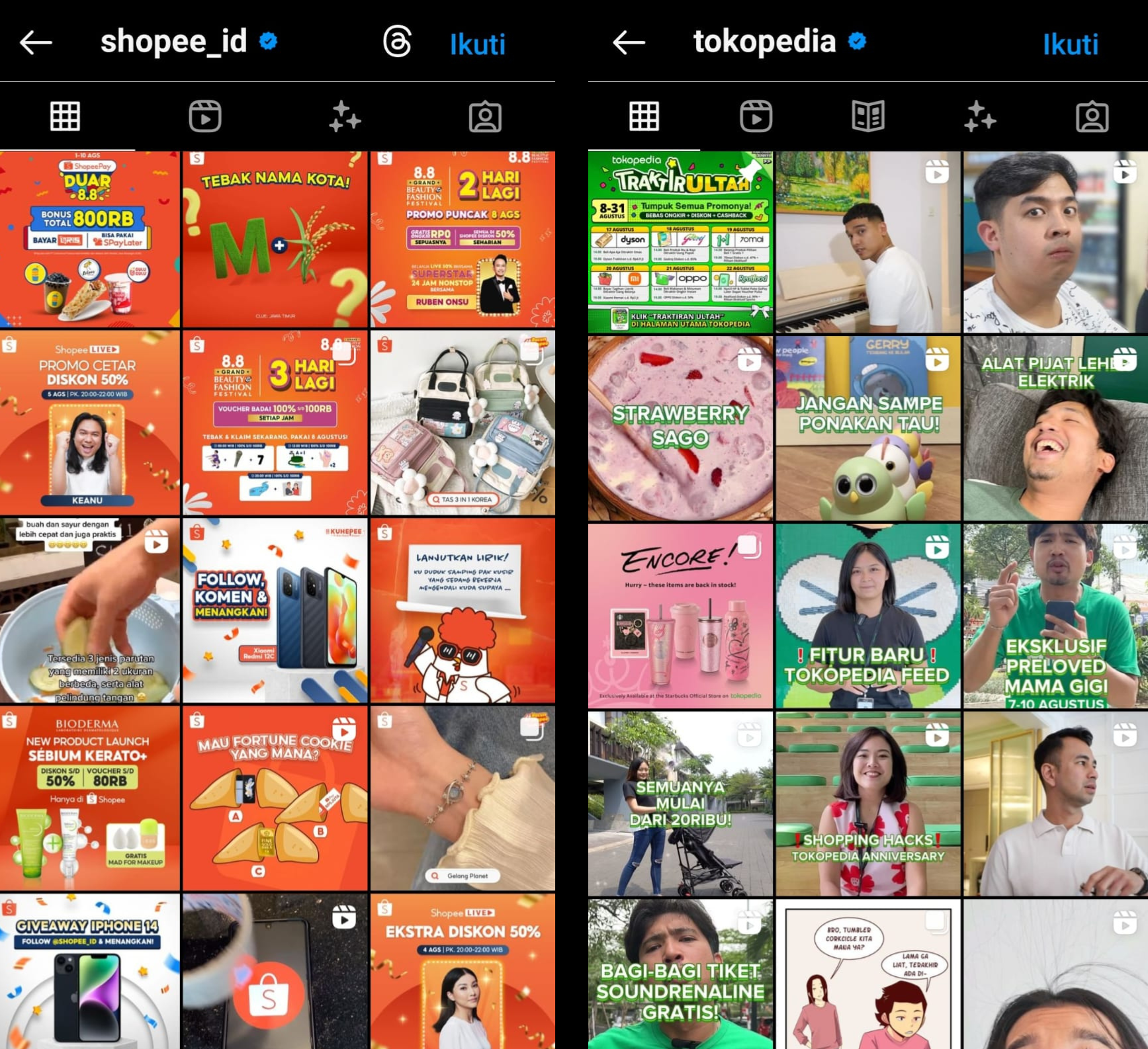Contohnya instagram brand Shopee yang menggunakan warna oranye di konten instagram Shopee baik dari background dan warna tulisan. Hal ini juga dilakukan brand Tokopedia yang menggunakan sebagian besar warna hijau di konten instagram Tokopedia. Hal ini akan membuat audiens mudah mengenali brand tersebut.