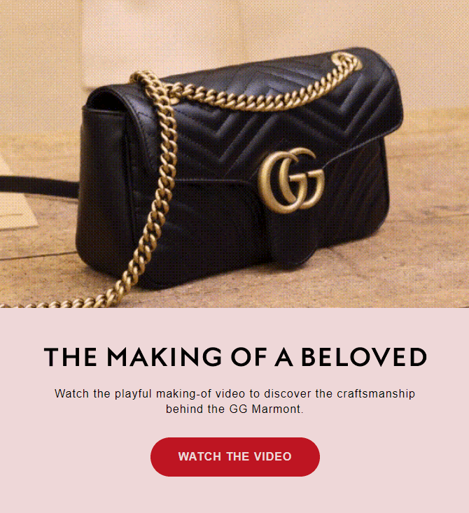 Contoh bagus lainnya dari pemasaran email video adalah yang di bawah ini dari Gucci. Untuk mempromosikan tas GG Marmont dan lebih melibatkan pelanggan dengan merek tersebut, mereka menggunakan video tentang cara pembuatan tas ini.